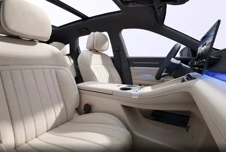 La funcionalidad de los asientos en la versión de cinco plazas insignia puede describirse como lujosa. Ambos asientos delanteros cuentan con ajuste eléctrico, incluyendo desplazamiento longitudinal, inclinación del respaldo y ajuste de altura. El asiento del conductor incorpora soporte lumbar eléctrico en 4 direcciones y un raro sistema de masaje neumático de 10 puntos que alivia eficazmente la fatiga al conducir. Los asientos delanteros también cuentan con calefacción y ventilación, adoptando un diseño único de “soplo en el cojín, succión en el respaldo” para mayor confort y evitando la incomodidad del flujo de aire directo. El asiento del pasajero delantero incluye una “tecla jefe”, que permite a los pasajeros traseros ajustar fácilmente su posición, creando más espacio en la segunda fila a la derecha. Los asientos traseros ofrecen ajuste de reclinación del respaldo y pueden incluir opcionalmente la “tecla jefe”, aumentando aún más la comodidad. Un detalle práctico es la mesa plegable de la segunda fila, integrada en el reposabrazos central trasero y con capacidad de 30 kg, ideal para colocar una tablet, trabajar o comer de manera estable y cómoda.