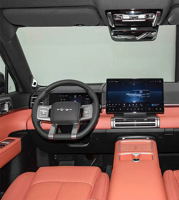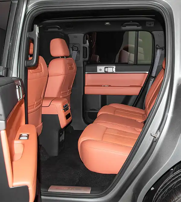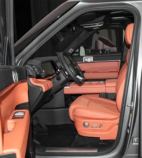 El Formula Leopard Tai 7 2025 135KM 2WD Pro presenta un exterior robusto, con líneas elevadas en el capó que se combinan con relieves en los paneles. Sus faros divididos son afilados y llamativos, mientras que el logotipo iluminado asegura gran reconocimiento. El protector plateado en forma de “H” y la doble parrilla equilibran la refrigeración con una fuerte presencia todoterreno. Un LiDAR montado en el techo resalta la conducción inteligente avanzada. Con 4999 mm de largo y 2920 mm de distancia entre ejes, sus líneas resultan elegantes e imponentes. El techo plano, las ventanas oscurecidas y las barras de techo refuerzan el carácter off-road. En la parte trasera, el diseño cuadrado incluye una puerta lateral con caja de almacenamiento externa equipada con toma de 220V y ganchos. Las luces traseras continuas hacen eco del diseño frontal, aportando refinamiento. En el interior, los asientos de cuero Nappa 2+3 ofrecen comodidad y versatilidad, mientras que el sistema de audio de 20 altavoces y el techo panorámico elevan aún más la experiencia de lujo.