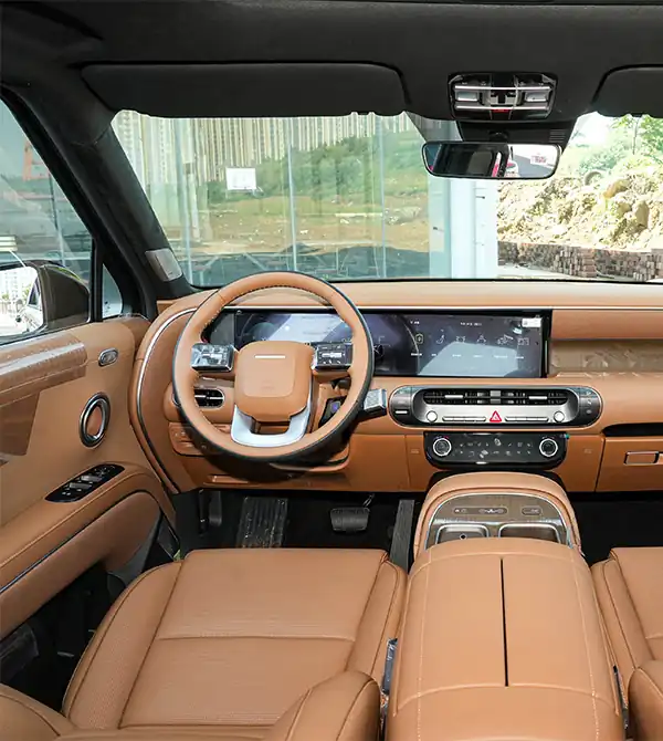 En el interior, la cabina transmite lujo y amplitud, con detalles que reflejan el cuidado de Hyundai por los ocupantes. El tablero y los paneles de las puertas usan materiales blandos con costuras delicadas, ofreciendo una sensación cálida y refinada. Las pantallas curvas panorámicas duales de 12,3 pulgadas dominan el interior, con alta resolución y función de deslizar con tres dedos para transferir información fácilmente entre la pantalla central y el panel de instrumentos, mejorando la interacción y conveniencia.