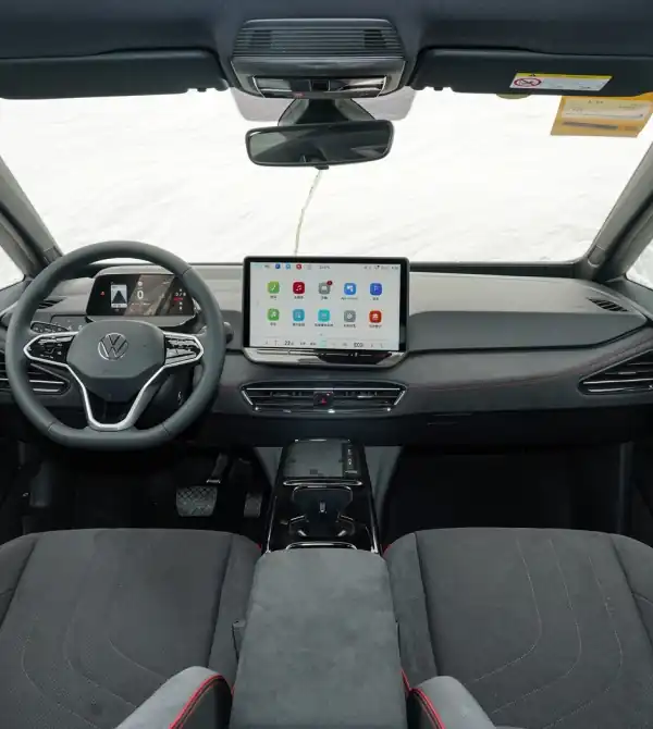 En cuanto al interior y las características, el Volkswagen ID.3 adopta un diseño minimalista con una paleta de colores en tonos oscuros. La cabina está revestida con materiales similares a la gamuza y detalles de costuras rojas para una apariencia refinada. El equipamiento de serie incluye un panel de instrumentos digital de 5.3 pulgadas, una pantalla táctil de infoentretenimiento de 12.9 pulgadas, un volante de tres radios y asientos deportivos. Entre las novedades se incluyen asientos delanteros ventilados y calefactables, faros LED matrix y llave digital. La Edición Premium de alta gama también incluye un AR-HUD (pantalla frontal de realidad aumentada), que realza la sensación de tecnología.
