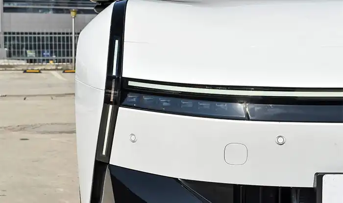 El diseño de los faros es refinado y distintivo: la luz horizontal continua se une con las luces diurnas verticales en las esquinas, mientras que los faros LED matriciales se integran de forma discreta, logrando una perfecta fusión entre funcionalidad e integración estética. El paragolpes delantero incorpora una parrilla activa de admisión de aire que ajusta su apertura de forma inteligente según las necesidades de refrigeración, junto con un radar milimétrico oculto y un soporte de matrícula flotante, aportando riqueza de detalles dentro de un diseño minimalista. La toma de aire inferior con diseño de panal en tres secciones, combinada con molduras plateadas, añade un toque deportivo a su carácter tecnológico, siendo considerado como un verdadero “símbolo móvil del futuro”.