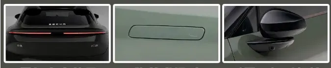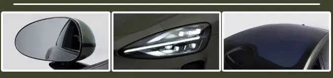 El diseño exterior ahora es más sofisticado y preciso. Las tomas de aire del parachoques son cuadradas, las líneas de la carrocería más angulosas y agresivas. Las luces diurnas dobles sobre el capó son más gruesas, y todas las versiones incluyen de serie faros inteligentes ADB. Sus dimensiones son 4790/1960/1499 mm (L/A/H), con una distancia entre ejes de 2888 mm. El parachoques trasero y faldones ahora son negro brillante. Se suman dos colores nuevos: Morado Cielo Distante y Plata Luz de Luna. En total ofrece nueve colores exteriores, cinco interiores, dos temas de carrocería y dos colores de pinzas de freno. También se rediseñaron las llantas, ahora de 20 pulgadas con diseño de cinco radios “Wind Speed”.