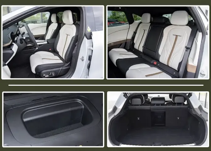 Los asientos siguen un estilo deportivo acorde al diseño exterior, con tapicería de cuero sintético de serie y opción a cuero genuino. Las funciones esenciales incluyen ajuste eléctrico con memoria, calefacción y ventilación. El espacio de carga ofrece un práctico maletero delantero de 105 litros y un trasero de 517 litros (RWD) o 493 litros (AWD).